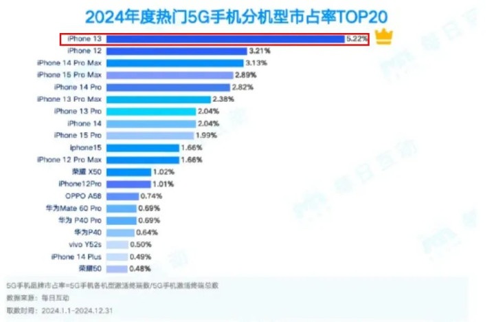 它就是iPhone13,你先别喷,听我为啥写它。一方面,我昨天看同行发了2024年的5G手机市占率分布图,iPhone13居然排在第一,并且遥遥领先,有广泛的群众基础。另一方面,现在手机CPU性能过剩,iPhone13的A15处理器还算坚挺。