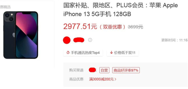 再来说价格,根据今天张大妈爆料,原价3699元的iPhone13(128G版),通过多重满减和国补15%,最后实付2977.51元。相比2021年9月5999元的首发价,三年半降了一半。
