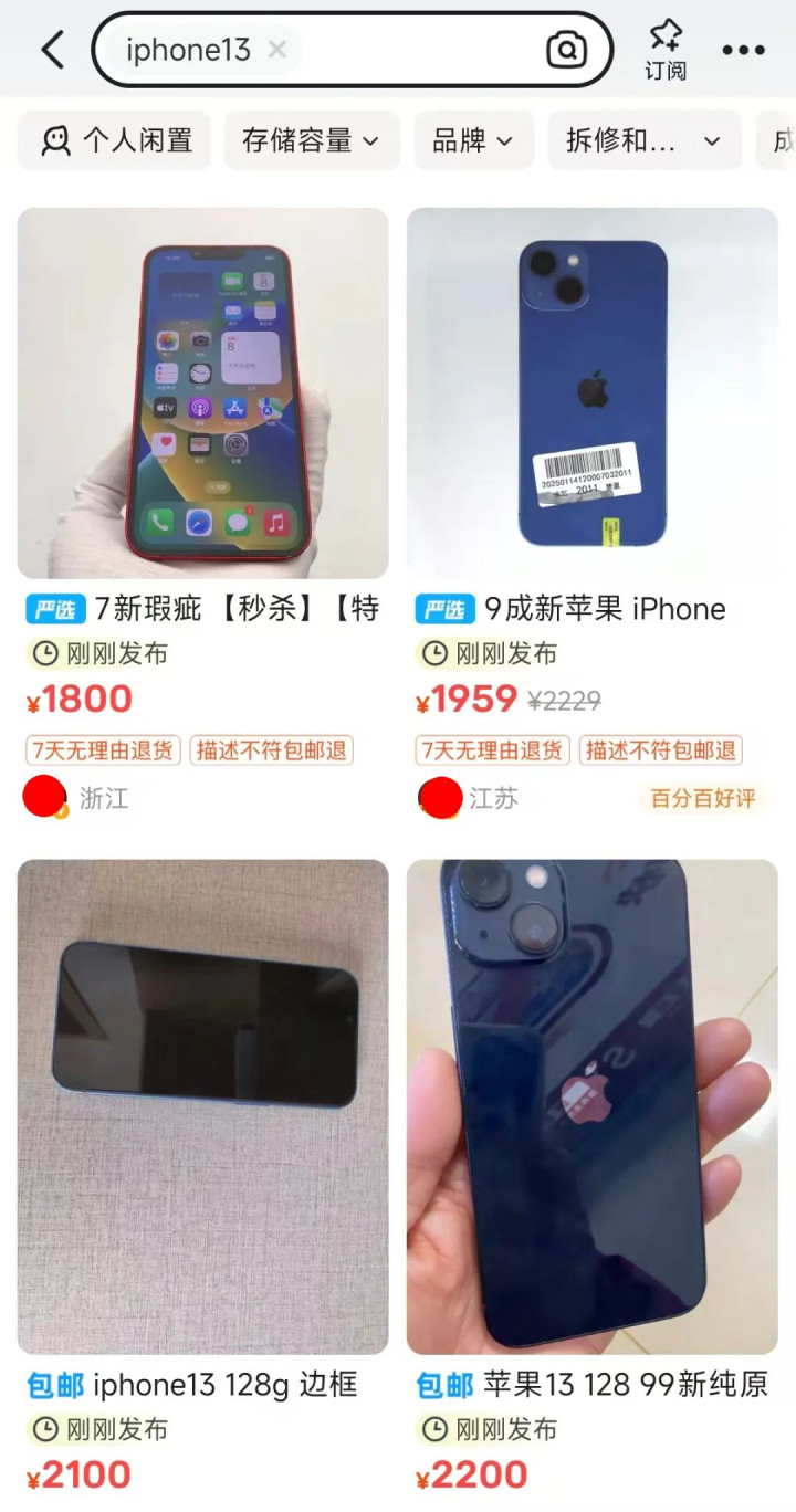 至于iPhone13的二手行情,我也大概看了一下,如果是好成色的机器,大概在2200元左右,95-99新极品成色(电池95%以上健康度)要2400元左右。此外2000元以内也很容易搜到,但成色大多一般,电池健康度80%左右甚至更低。